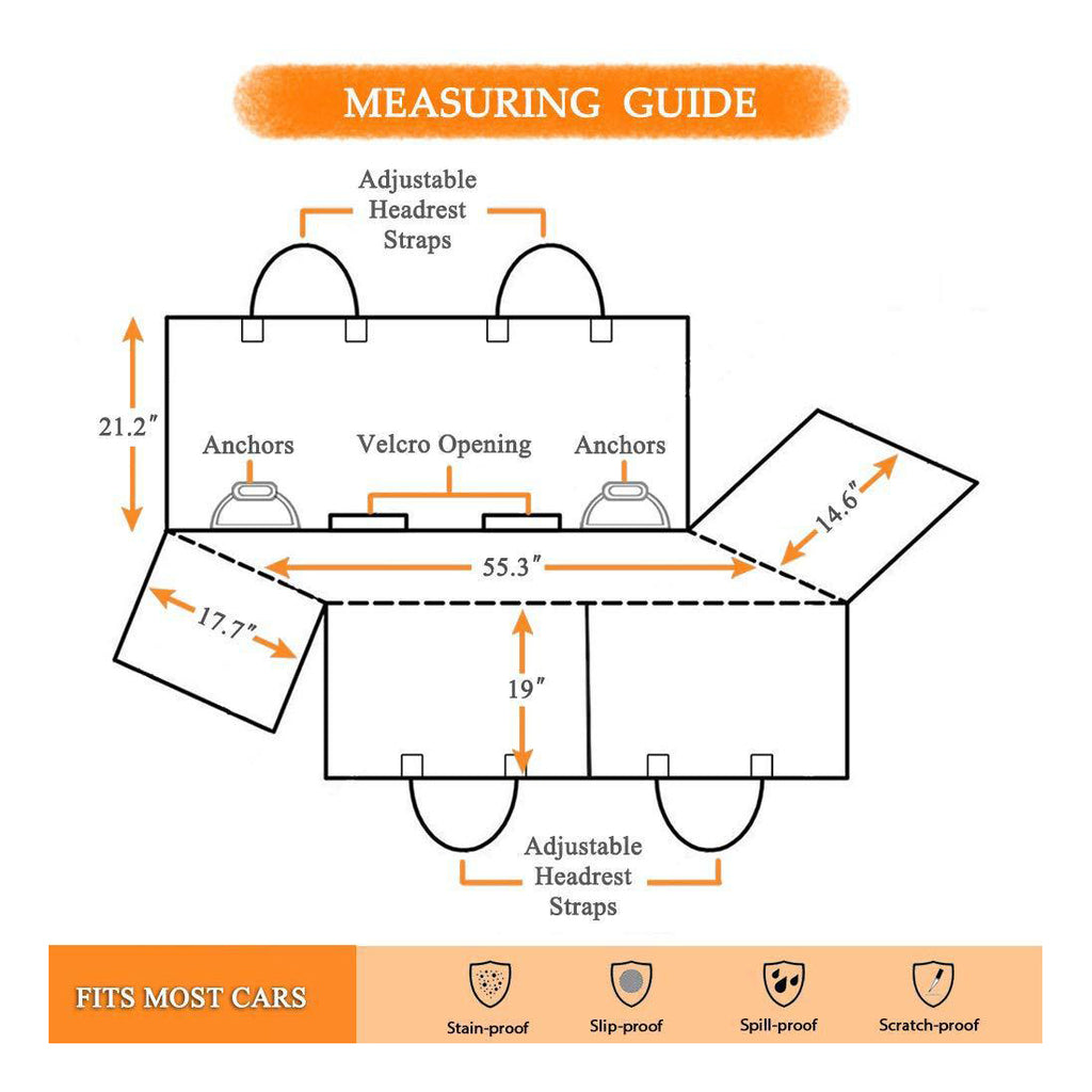 • ADJUSTS TO YOUR NEEDS- FINALLY YOUR KIDS & PETS CAN SIT TOGETHER: No matter if you have a SUV, or another car, this top-notch dog seat covers is going to serve you well. Universal fit (54Wx58L inches) fit to most standard cars, SUVs and trucks. Adjust the middle zipper according to your needs, so your kids and pets can share the back seats of your car without hassle. Bonus gifts included - 2 headrest protectors and a seat belt in order to ensure your maximum security.