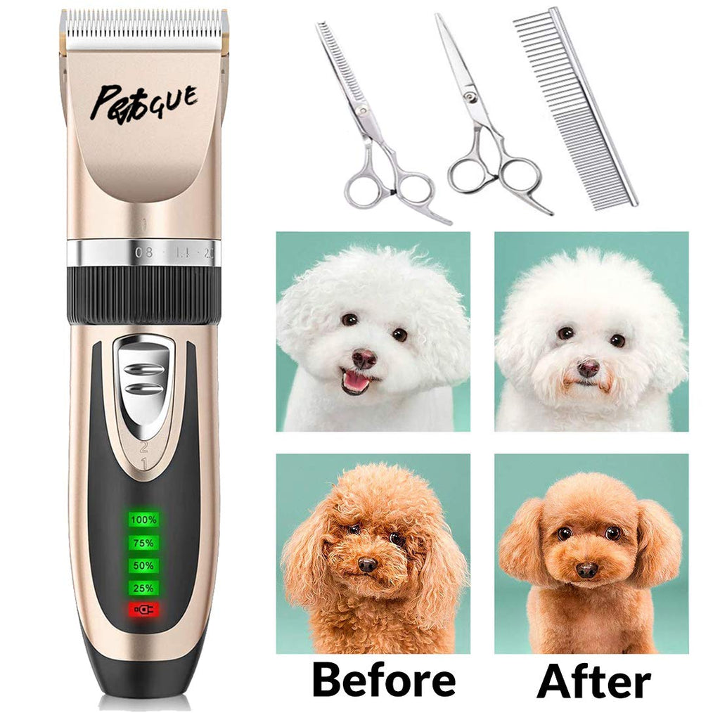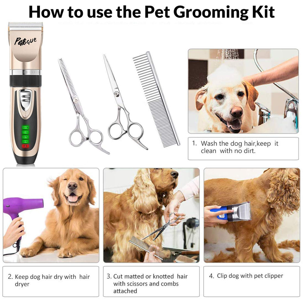 • ✔ALL IN ONE: This PetVogue dog grooming clippers come with: 1 × Pet Electric clipper( included Battery),1 × AC Power Adapter,1 × Cleaning Brush,4 × Comb Attachments(3-6-9-12mm),1 × Stainless Steel Scissor,1 ×Stainless teeth scissor,1 × Stainless Steel Comb,1 × Straight scissor